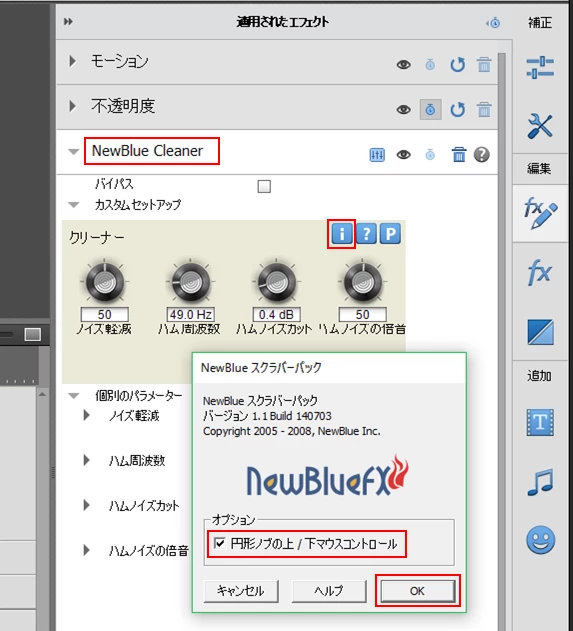 確認したところ、「i」をクリックすると、「NewBlueスクラバーパック」ウィンドウが開きます。ここの「円形のノブの上/下・・・・」にチェックを入れ、「OK」をクリックし、ノブ操作をしてから、「クリーナー」部のノブがぐるぐる回るようになりました。
