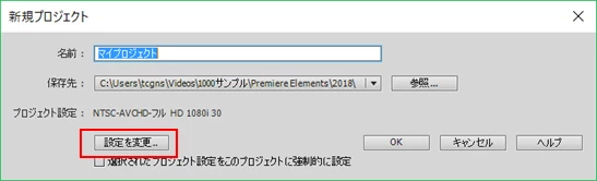 ②開いた「新規プロジェクト」ウィンドウで「設定を変更」をクリックします(下図赤枠部)。