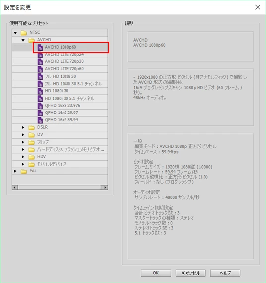 ③開いた「設定を変更」ウィンドウで、「使用可能なプリセット」を「AVCHD 1080p60」を選択し(下図赤枠部)、「OK」をクリックします。