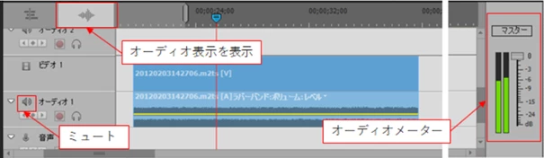 ③振れていない場合は、オーディオトラック左端の「ミュート」ボタンの状態を確認します。