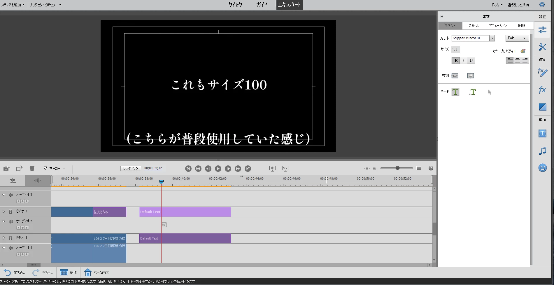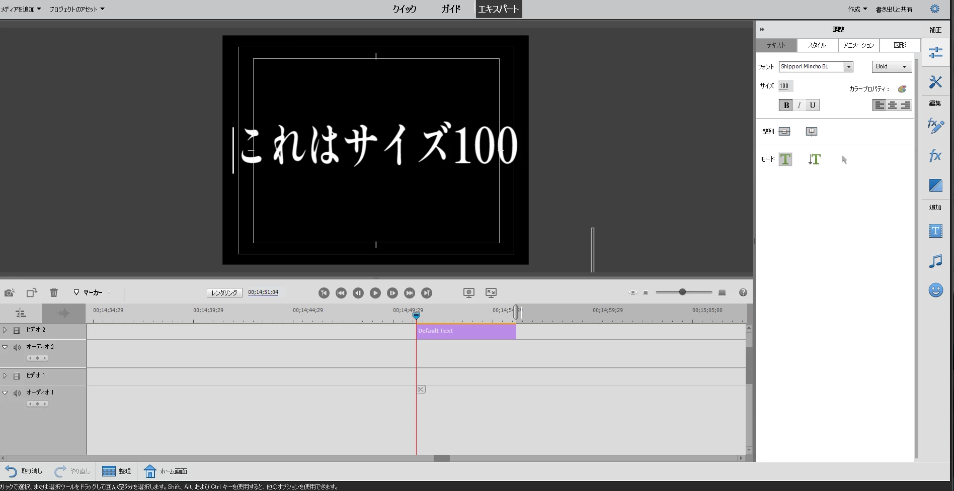 プロジェクトのフレームサイズが1920×1080の場合は、縦方向1080になりますので、フォントサイズが100の場合は、文字のサイズは相当小さく表示されます。