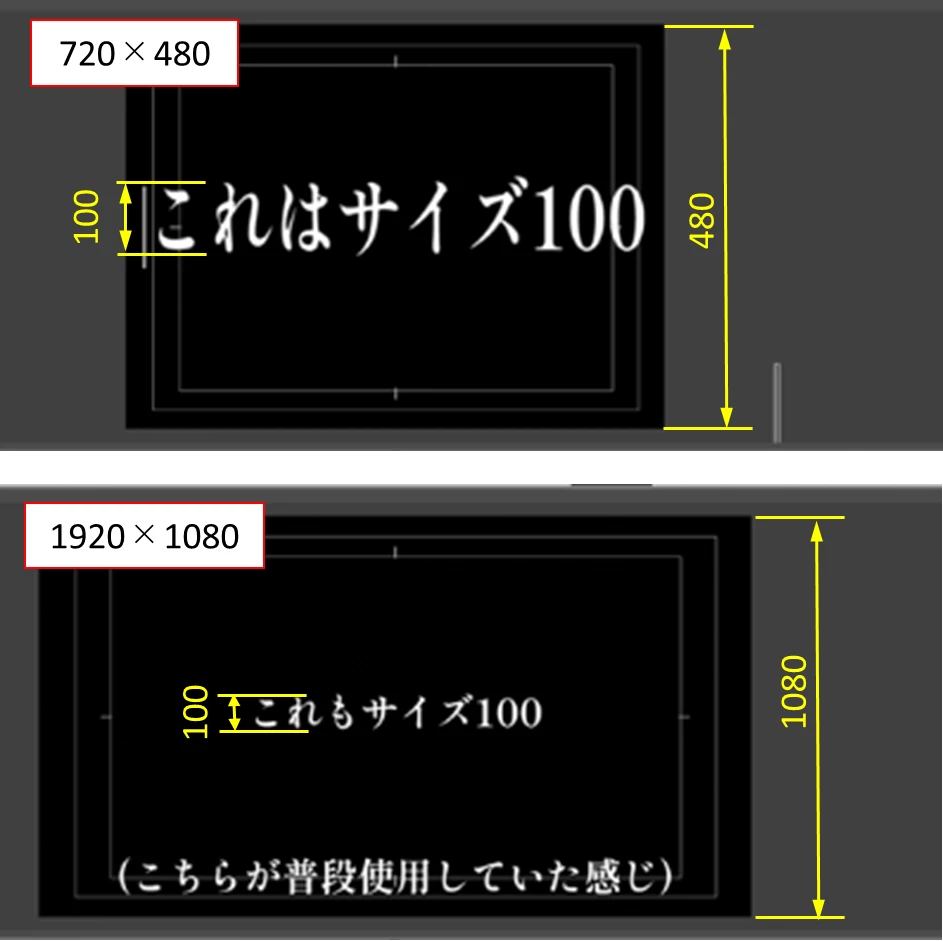 プロジェクトのフレームサイズが720×480の場合は、縦方向480になりますので、フォントサイズが100の場合は、文字のサイズは大きく表示されます。