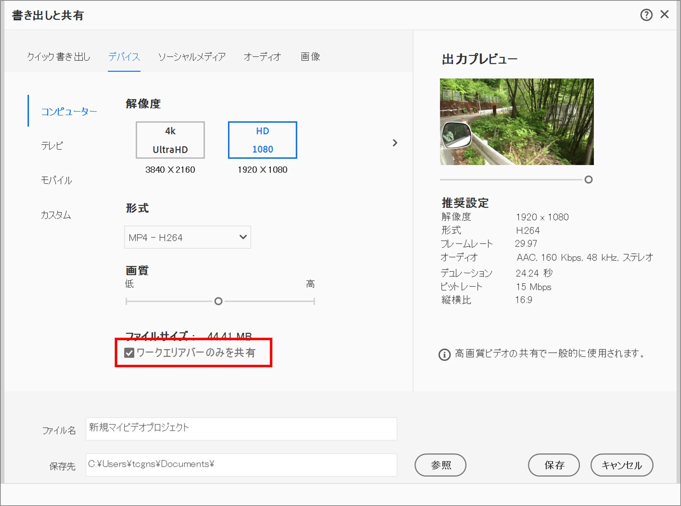 ②「書き出しと共有」で「ワークエリアバーのみを共有」にチェックを入れて書き出します。