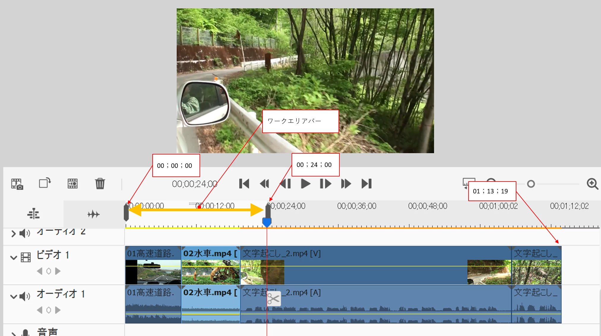 私の例では、動画の長さは「01;13;19」ですので、便宜的に「00;24;00」、「00;25;00」と残り(「00;24;19」)にしました。