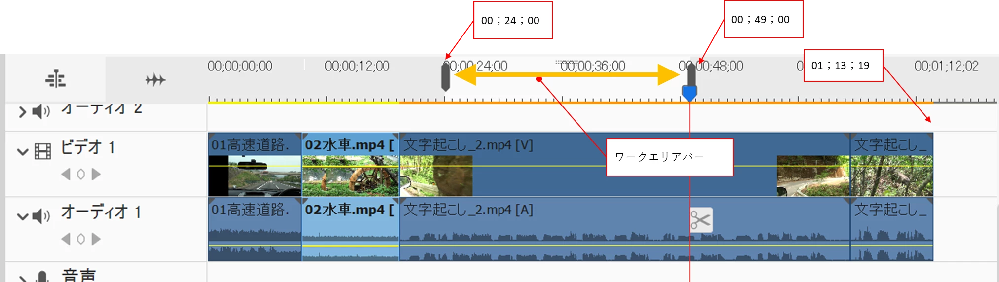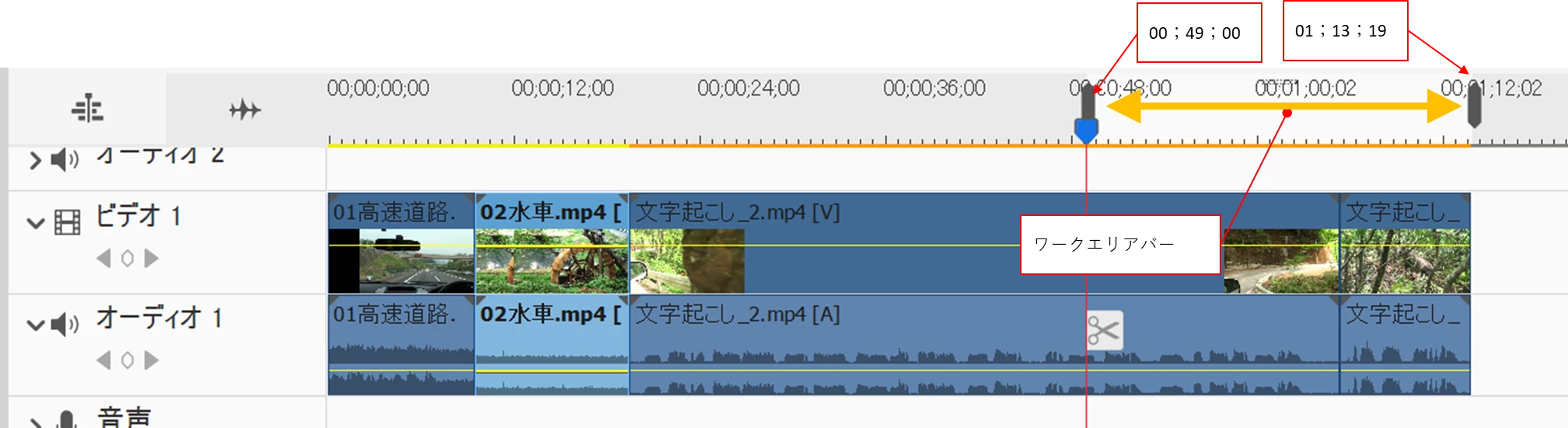 ③3等分の2番目、3番目を書き出す場合は、ワークエリアバーを次の時間に設定して行います。