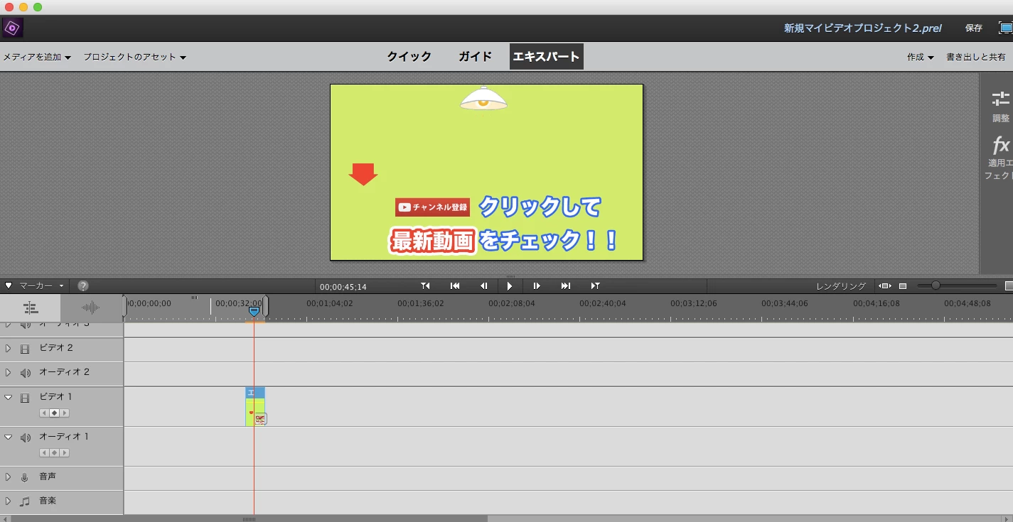 ②「タイムライン」パネルのスクリーンショット(クリップの配置状態を知りたい)
