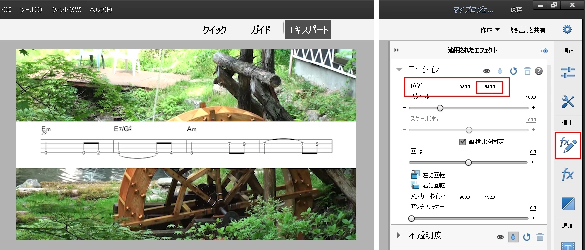 ②「fx+鉛筆」アイコンをクリックし、「調整されたエフェクト」パネルで「モーション」を展開し、「位置」を表示させます。