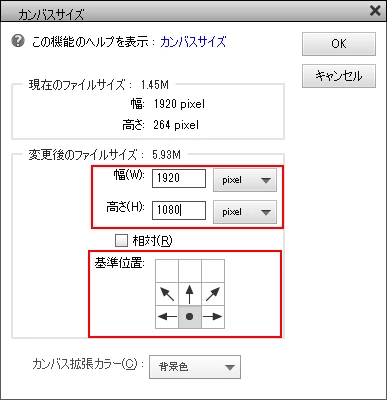 ②メニューの「イメージ」→「サイズ変更」→「カンバスサイズ」を選択し、開いた「カンバスサイズ」ウィンドウで下図のように設定します。