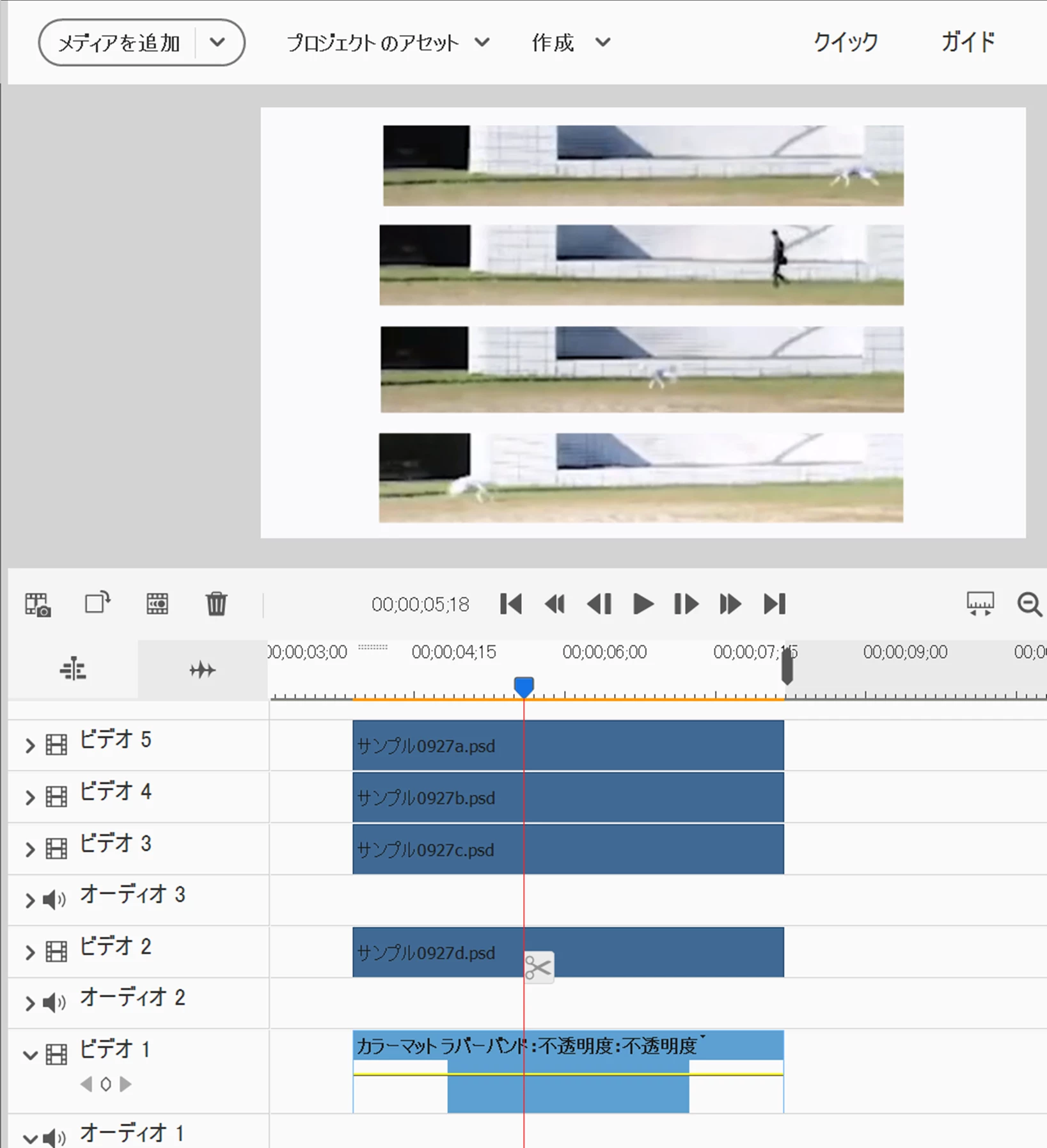 ビデオ1トラックに白のカラーマット、ビデオ2~5トラックに映像を時間軸を同じにして配置します。