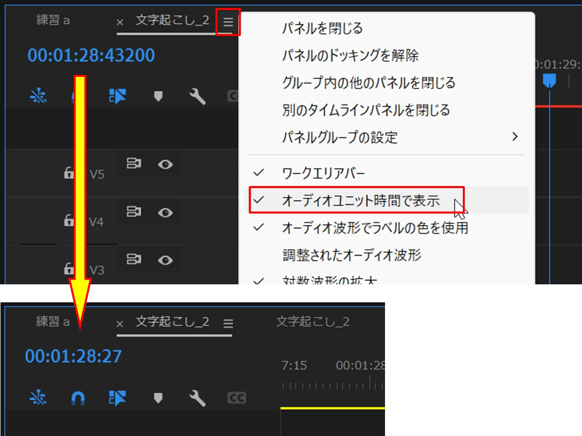 シーケンスの「パネル」メニューから開いたメニューから「オーディオユニット時間で表示」をクリックしてチェックをはずめば通常のタイムコードの戻ると思います。