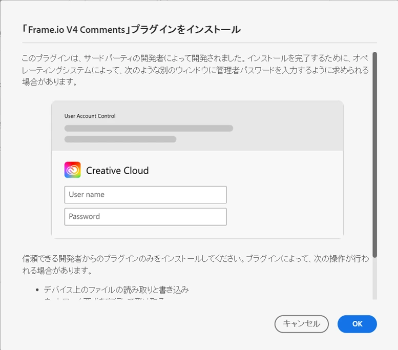 └ ログインエラー後、Frame.ioのパネルを一度閉じて、再度Fame.ioを開き直せばログイン状態でパネルは開く→しかし、上記のプロジェクトが作成できない。