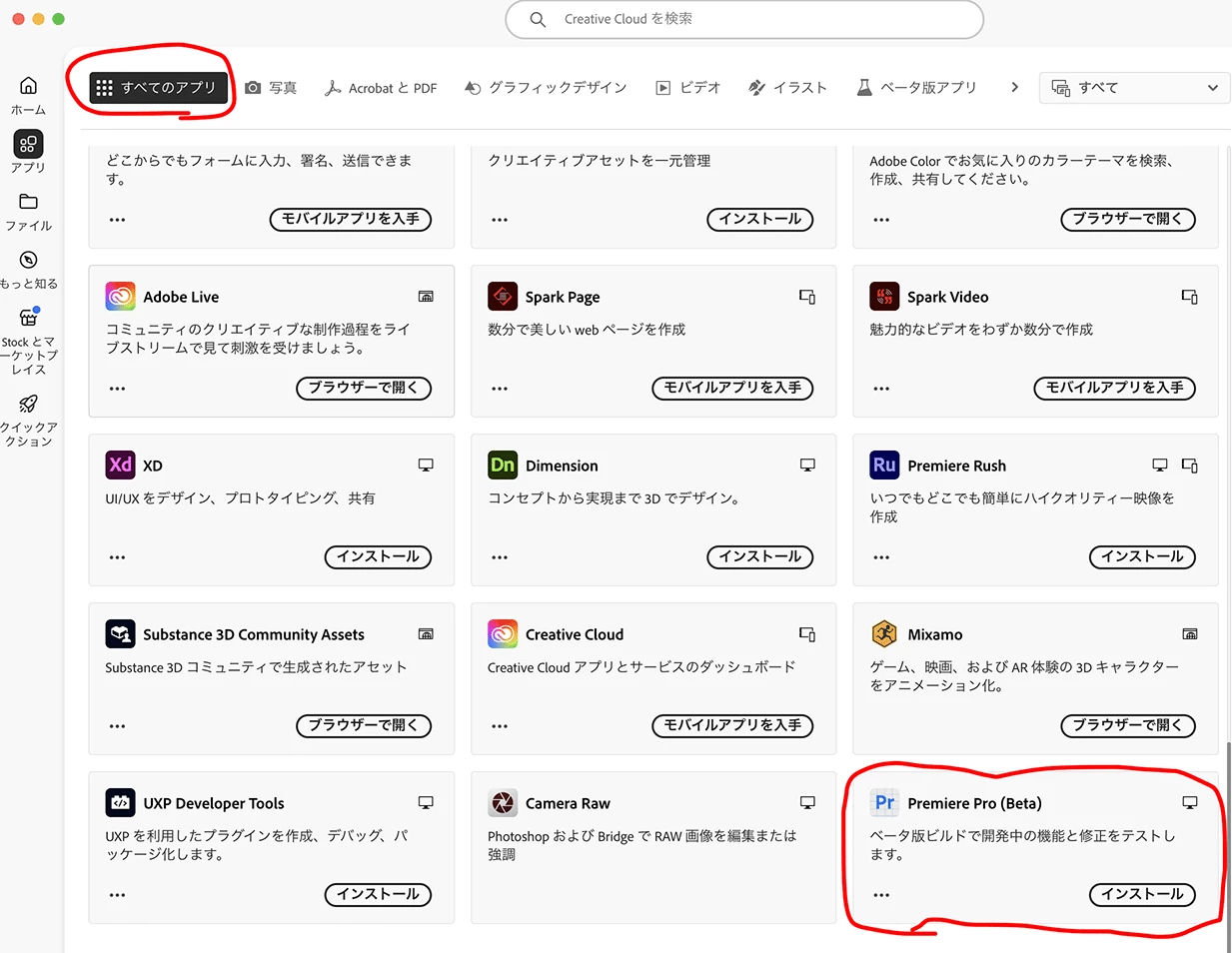 再度CleativeCloudからインストールしようとしたところ、項目にPremiere Pro (beta)の項目がありません。