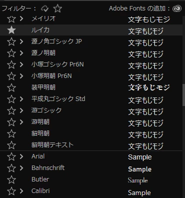 premiere proの日本語のテキストサンプル(文字もじモジ)のフォントサンプルが限られた一部のフォントしか反映されず、クリックするまでどんなフォントかわからないので作業スピードがものすごく落ちます、英語版フォントの(sample)はほとんどフォントサンプルは反映されています。