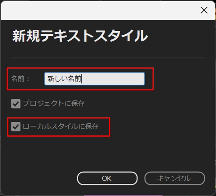 テロップに名称変更を行うスタイルを適用し、「リンクスタイル」項の「+」ボタンから「スタイルを作成」を選択して、「新規テキストスタイル」ウィンドウで変更後の名前を入力、「ローカルスタイルに保存」にチェックを入れ「OK」をクリックします。