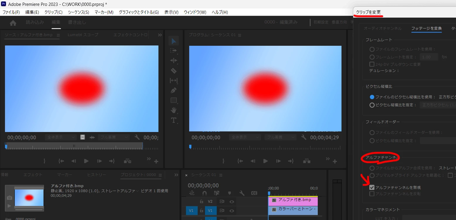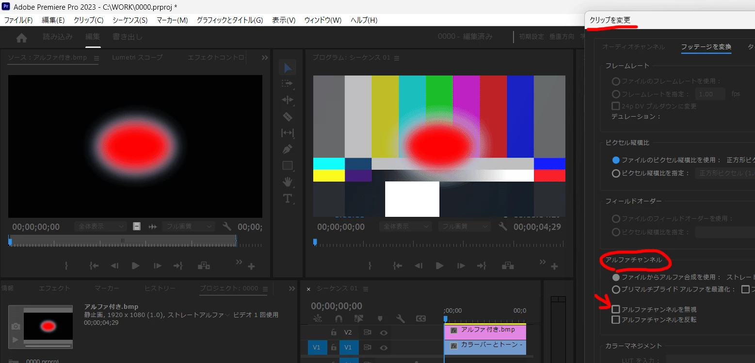 そのアニメ用画像の.bmpに、アルファチャンネルがついており、Premiere Pro で読み込むと、アルファチャンネルの部分(空)が真っ黒になっています。
