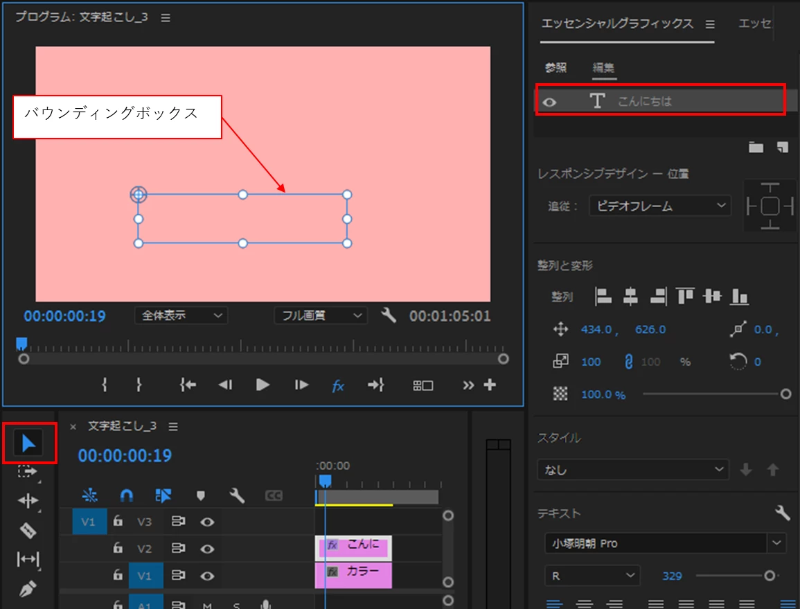 ①テキストレイヤーを選択し、「選択ツール」を選択すると、赤いテキスト入力ボックスが青いバウンディングボックスに変わります。