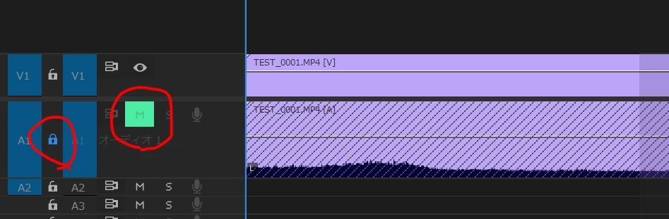 斜線だけ見ますと、シーケンスの左側のカギのアイコンが押されてトラックがロックされているようにも見えます。