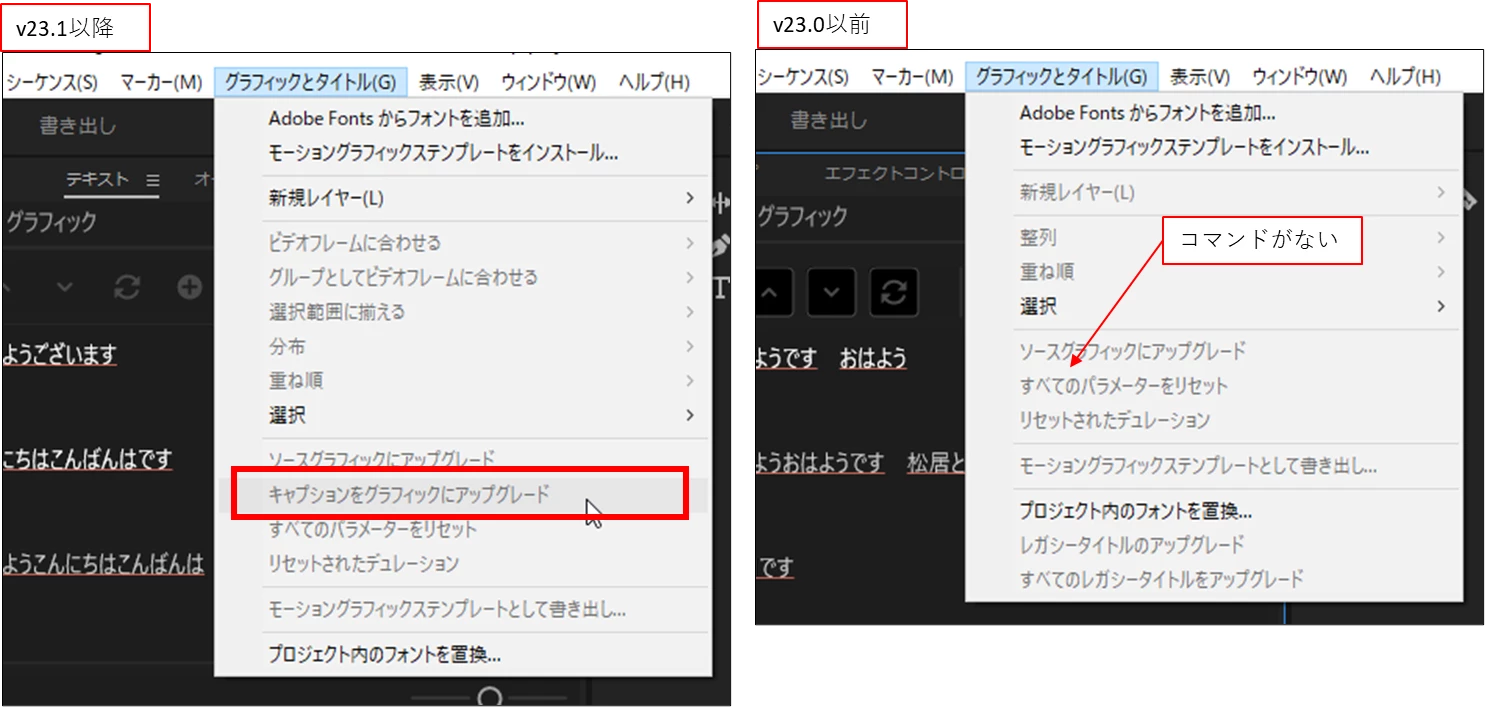「キャプションをグラフィックにアップグレード」コマンドが表示されていないのか、表示されていてもグレーで選択できないのかどちらでしょうか。