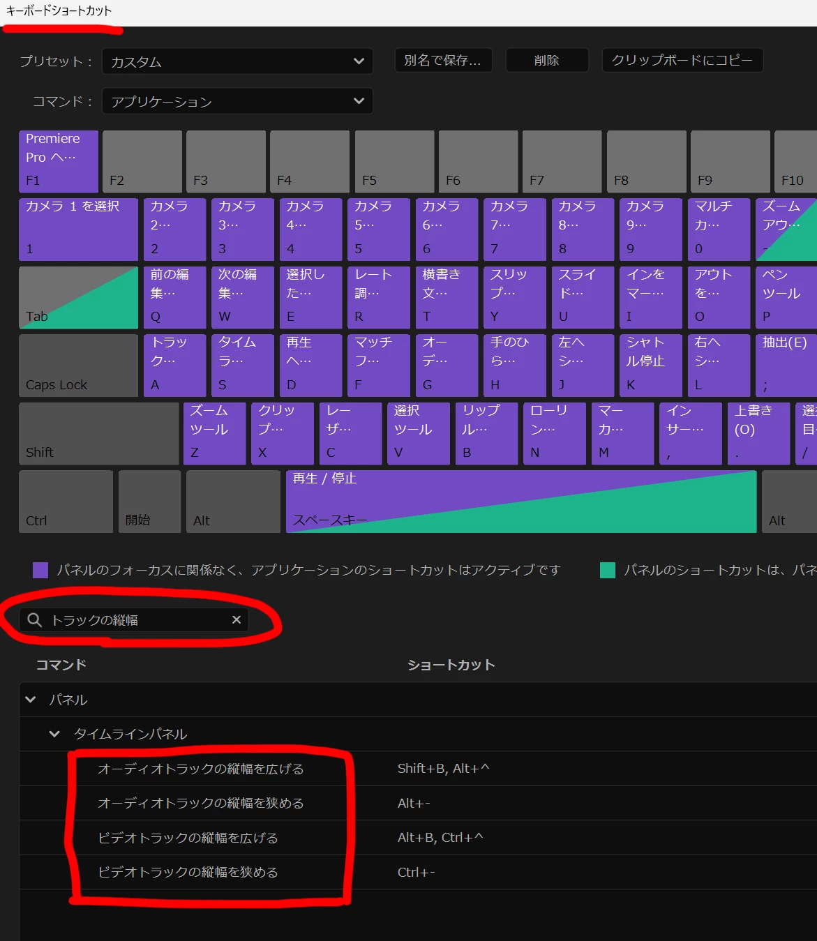 タイムラインの「トラックの縦幅」のことかと思いますので、キーボードショートカットの設定画面にある検索窓に、「」トラックの縦幅」と入れていただきますと、オーディオ・ビデオそれぞれのトラックの縦幅を広げるショートカットと狭めるショートカットの項目が出てきます。