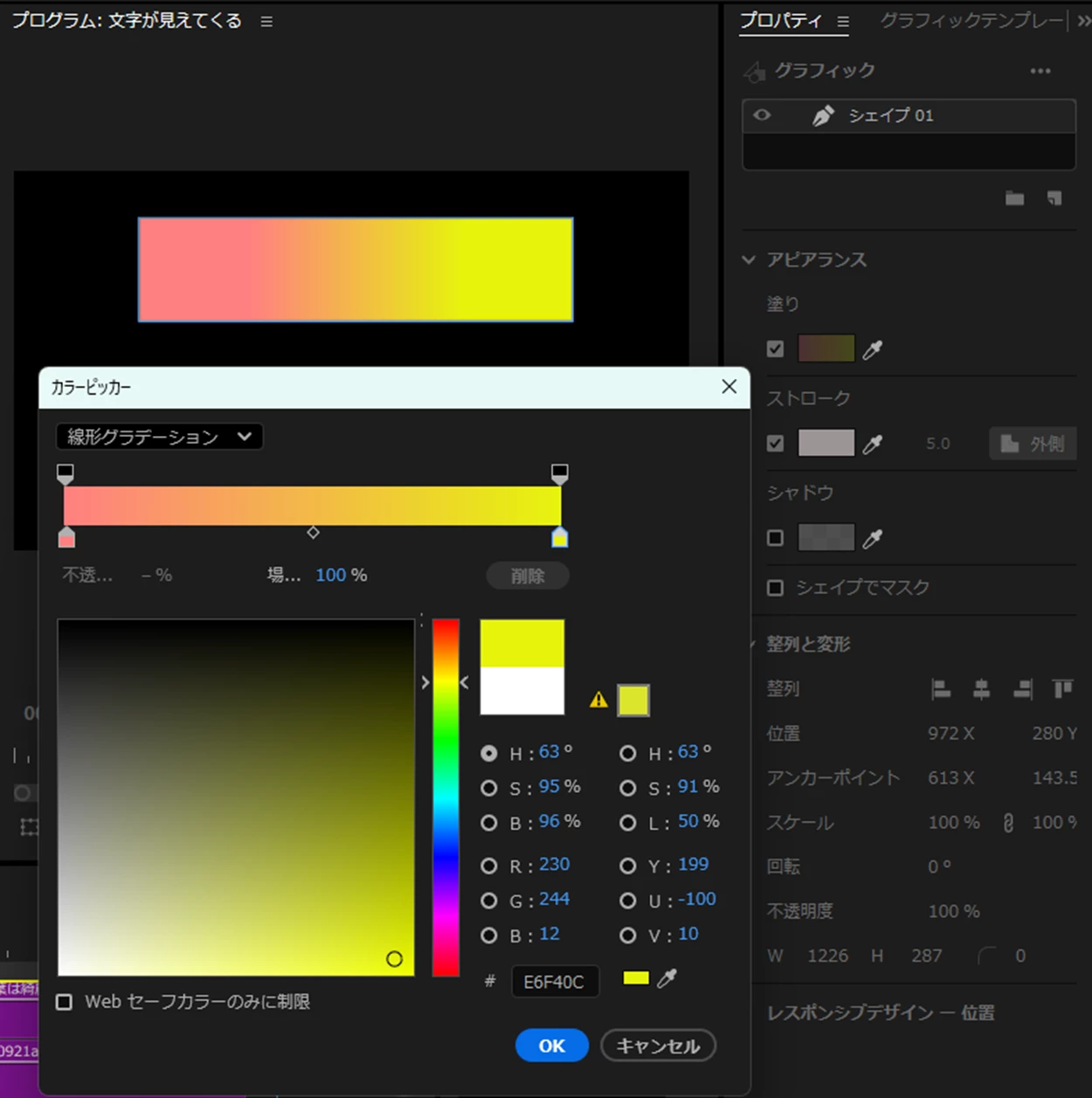 ①グラデーションを作成し、「OK」をクリックしてカラーピッカーを閉じます。