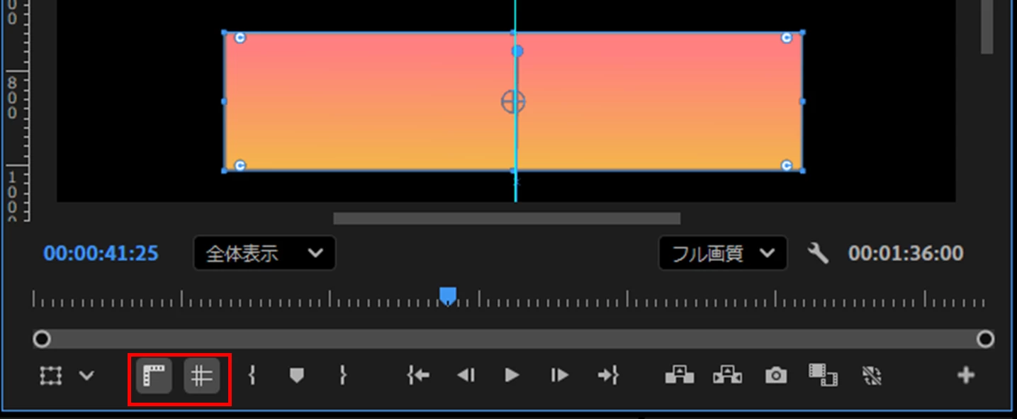 この操作を容易にするため、トランスポートコントロール部に「定規を表示」と「ガイドを表示」ボタンを表示させておくと良いです(下図赤枠部)。