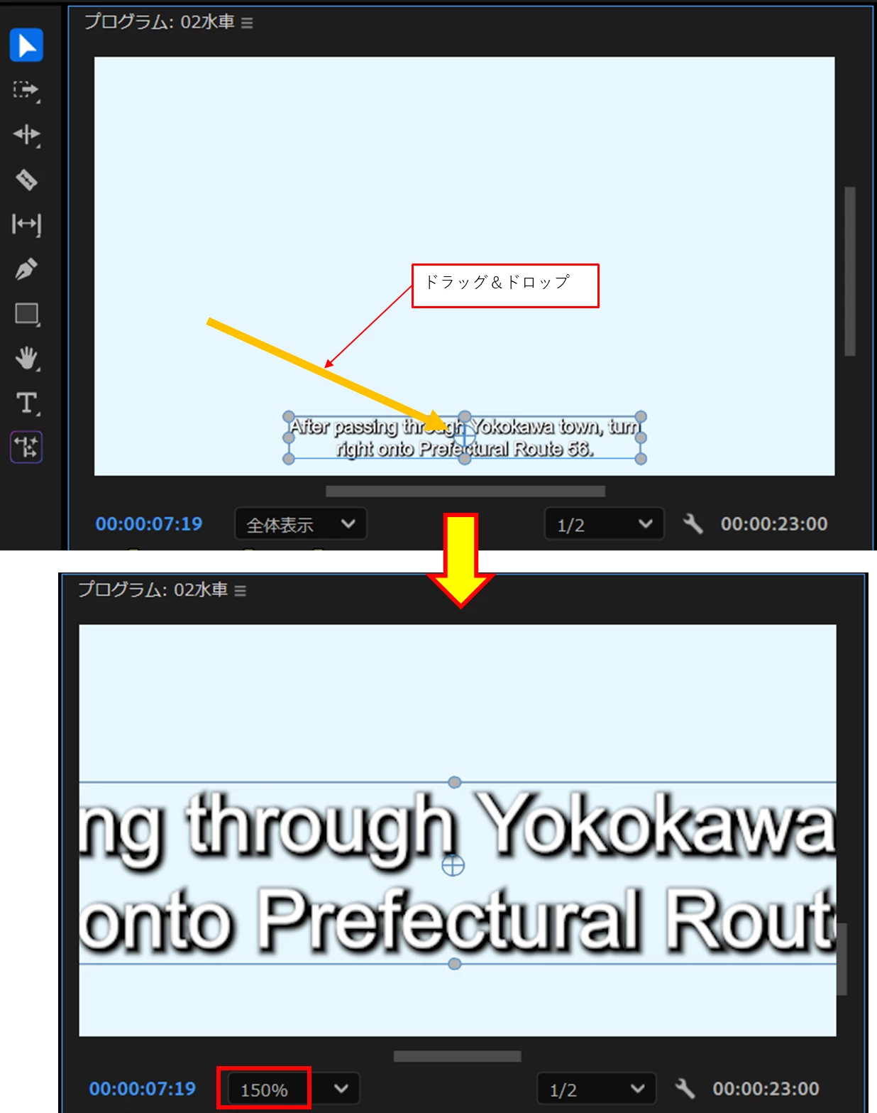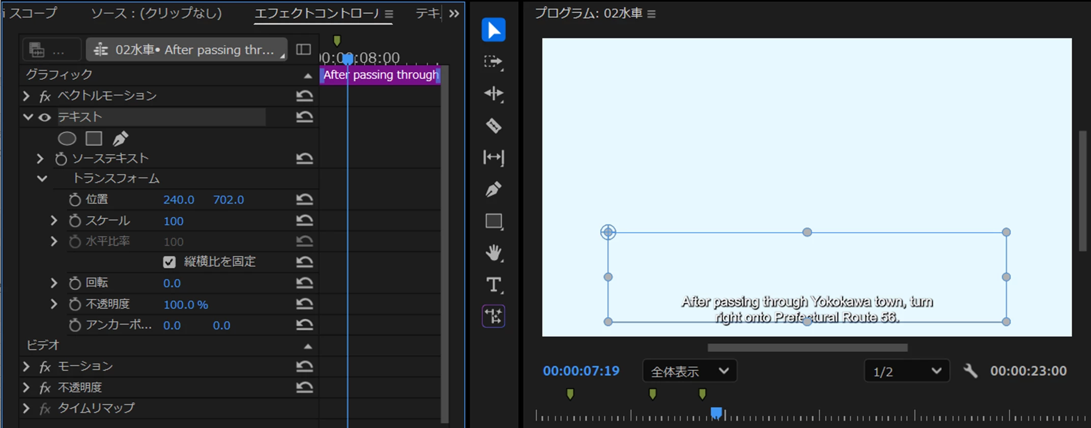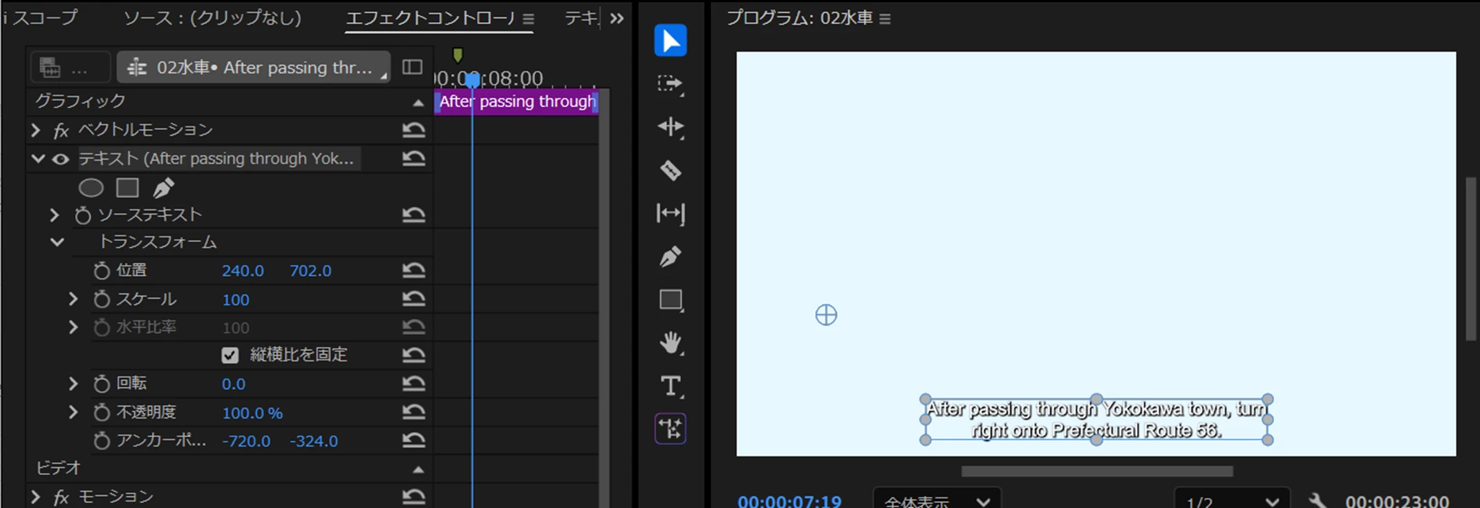 ①キャプションセグメントクリップに時点ではアンカーポイントの表示はありませんでした。「エフェクトコンロール」パネルも表示されません。