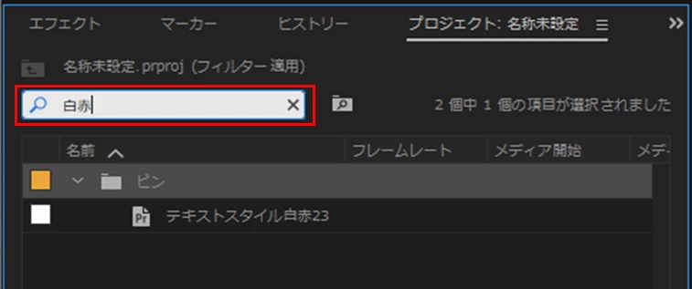 ①「プロジェクト」パネルの「検索窓」にスタイル名(スタイル名の一部でも可)を入力して検索すると表示されると思います。