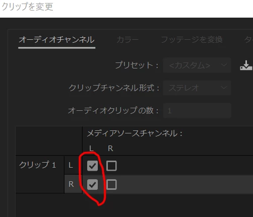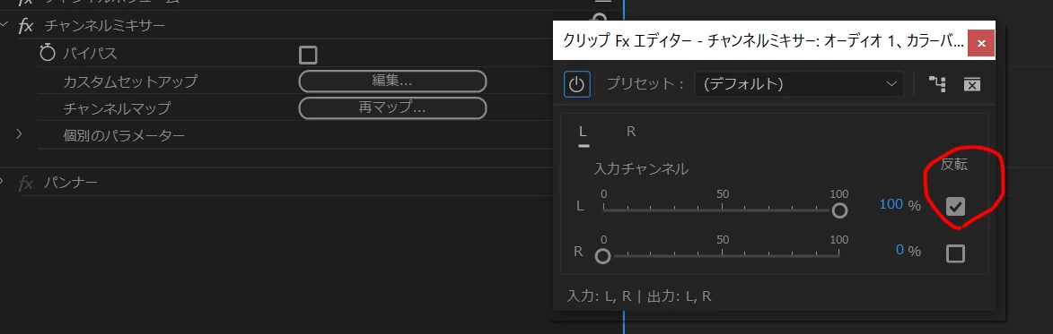 この場合、チャンネルミキサーで片側を反転させていただいたり、クリップの片チャンネルを両チャンネルに振る(片チャンネルを捨てる)といった方法で回避できるかと思います。