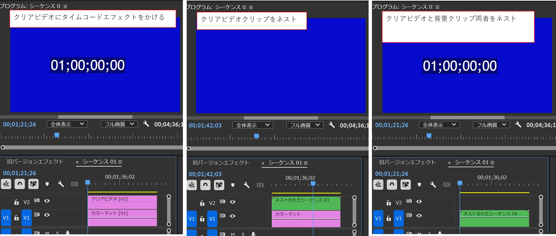 V1トラックの背景映像または画像クリップとV2トラックのクリアビデオクリップの両者を選択してネストすれば、タイムコードは表示されます。