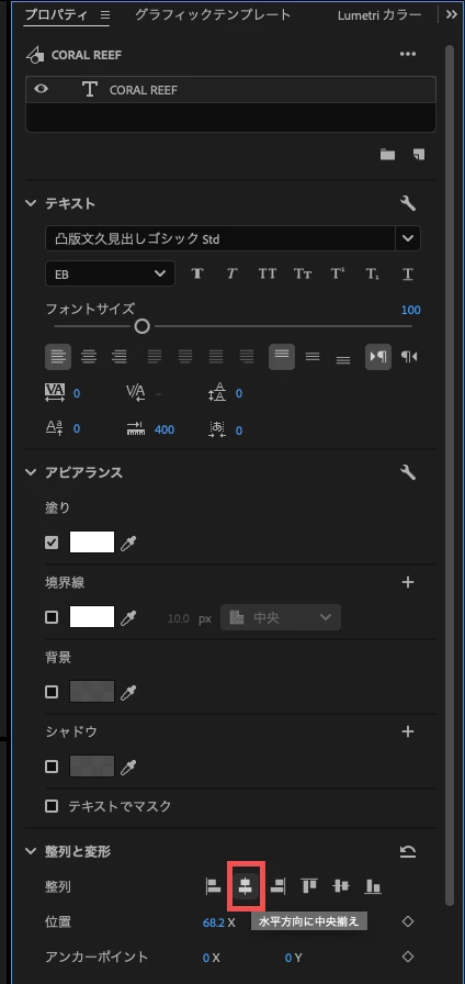 「画面の真ん中にテキストを持っていきたい」場合は、「整列と変形」にある「水平方向に中央揃え」でできると思います。一度お試しください。