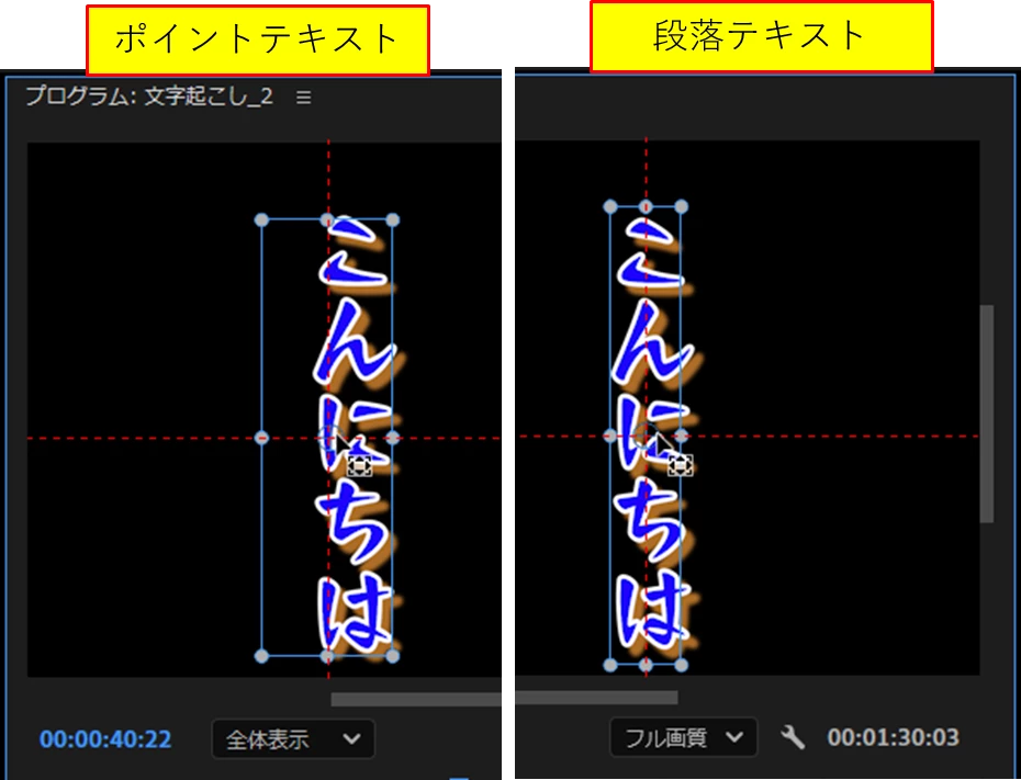 また、ポイントテキスト、段落テキストとも、Ctrlを押してドラックする方法、レンチアイコンから「プロクラムモニターをスナップイン」を選択する方法とも、アンカーポイントは中心に吸い付くようになりました。