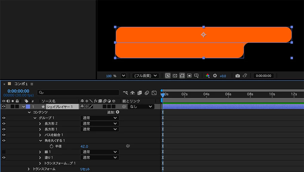 After Effectsのシェイプレイヤーの追加メニューに「角を丸くする」があるので、下図のような形状にできます。