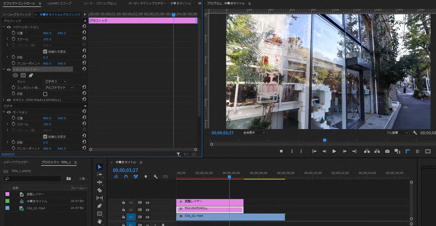 「トラックマットキー」エフェクトは、V2のTOKYO STROLLテキストクリップにかけ、「エフェクトコントロール」パネルの「トラックマットキー」でマットは「ビデオ3」、コンポジット用マットは「アルファマット」を設定します。
