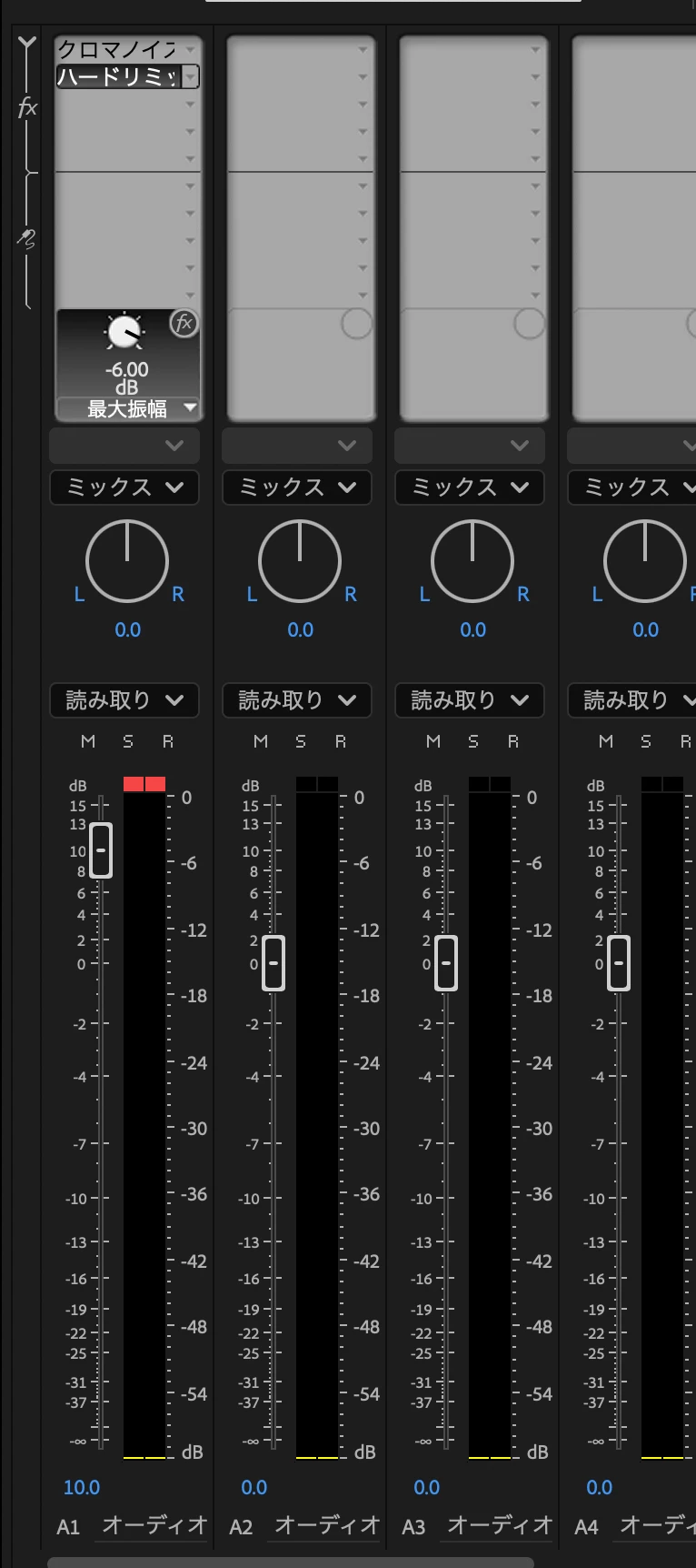 ちなみに、今回、音声エフェクトに関しては一列目にクロマノイズ除去を「-10%」で入れておりますが、これをいれず、ハードリミッターのみにしても同じです。