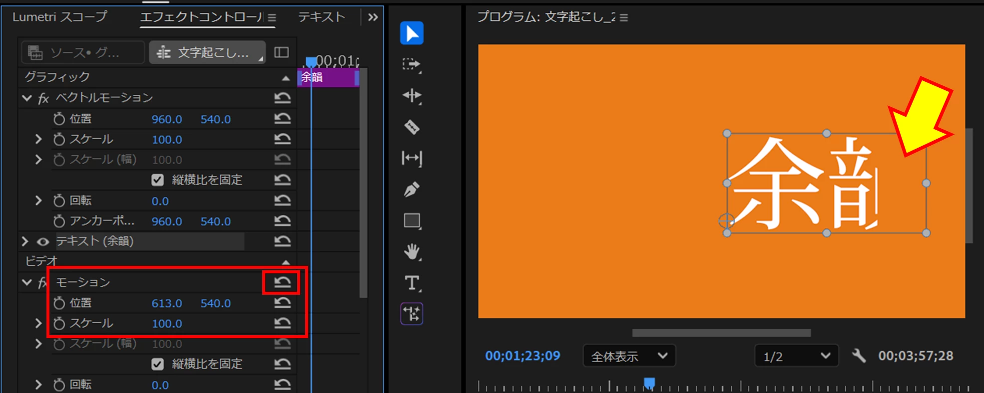 その場合は、「モーション」の右側にある左向き円弧矢印をクリックします。クリックすることで「モーション」の数値が初期値に戻ります。この時「余韻」が右側へずれると思いますので、「選択ツール」等で正しい位置へ移動してください。