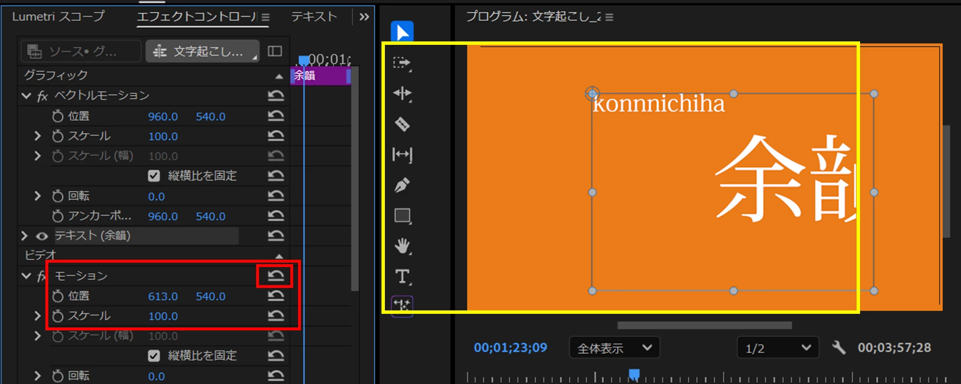 「モーション」の「位置」の左側数値が小さくなった場合は、表示範囲は左へ移動します(黄枠部)。このためテロップは黄枠部からはみ出した部分は表示されなくなります。