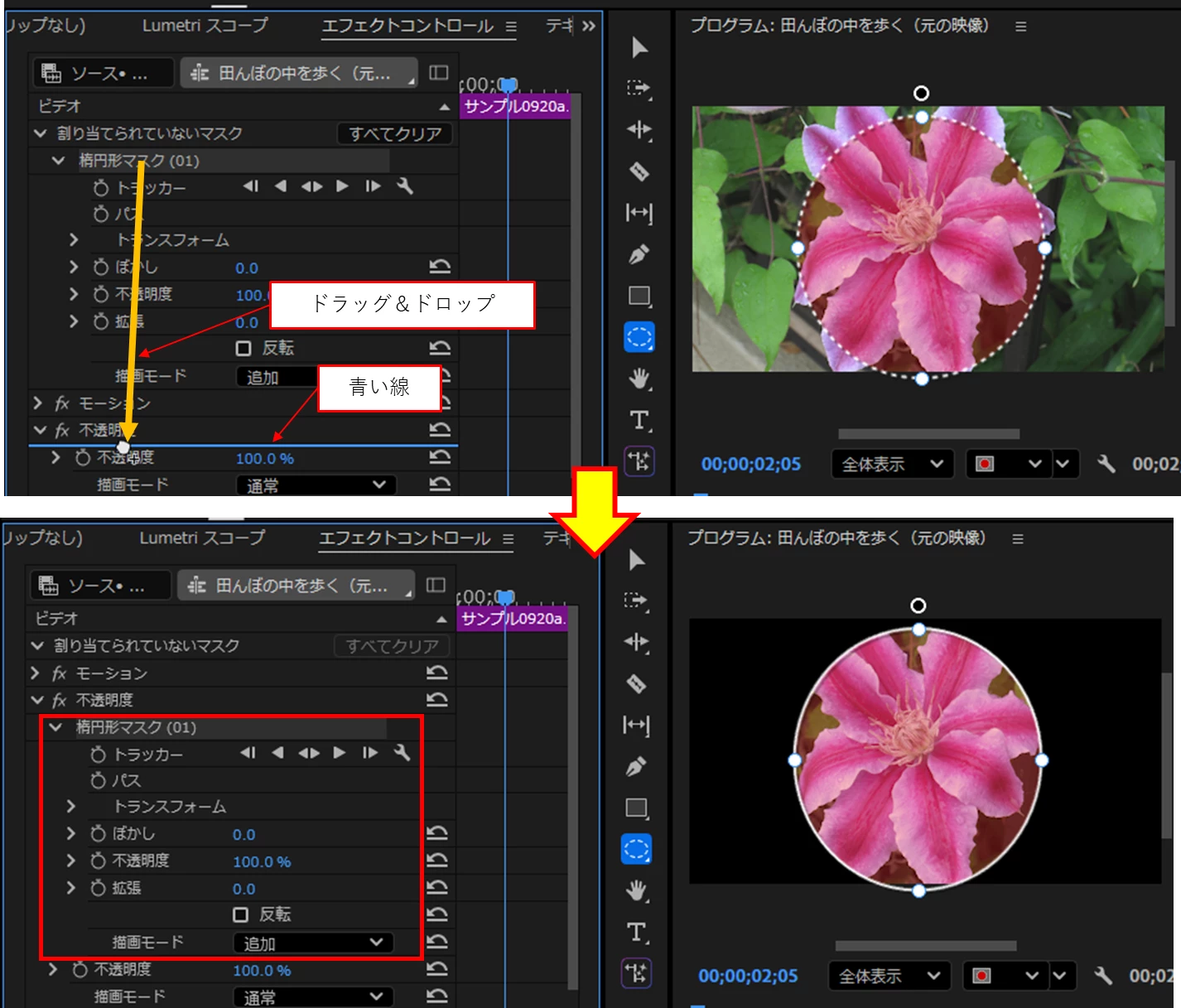 ③「不透明度」項に「楕円形マスクを適用する場合は、「楕円形マスク」を「透明度」項の下側(青い線が出ます)へドラッグ&ドロップします。