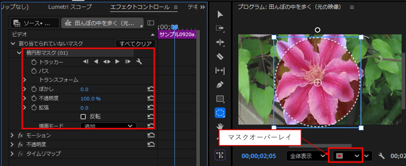 ここで、画像クリップに「楕円形マスク」の適用方法を説明をします。