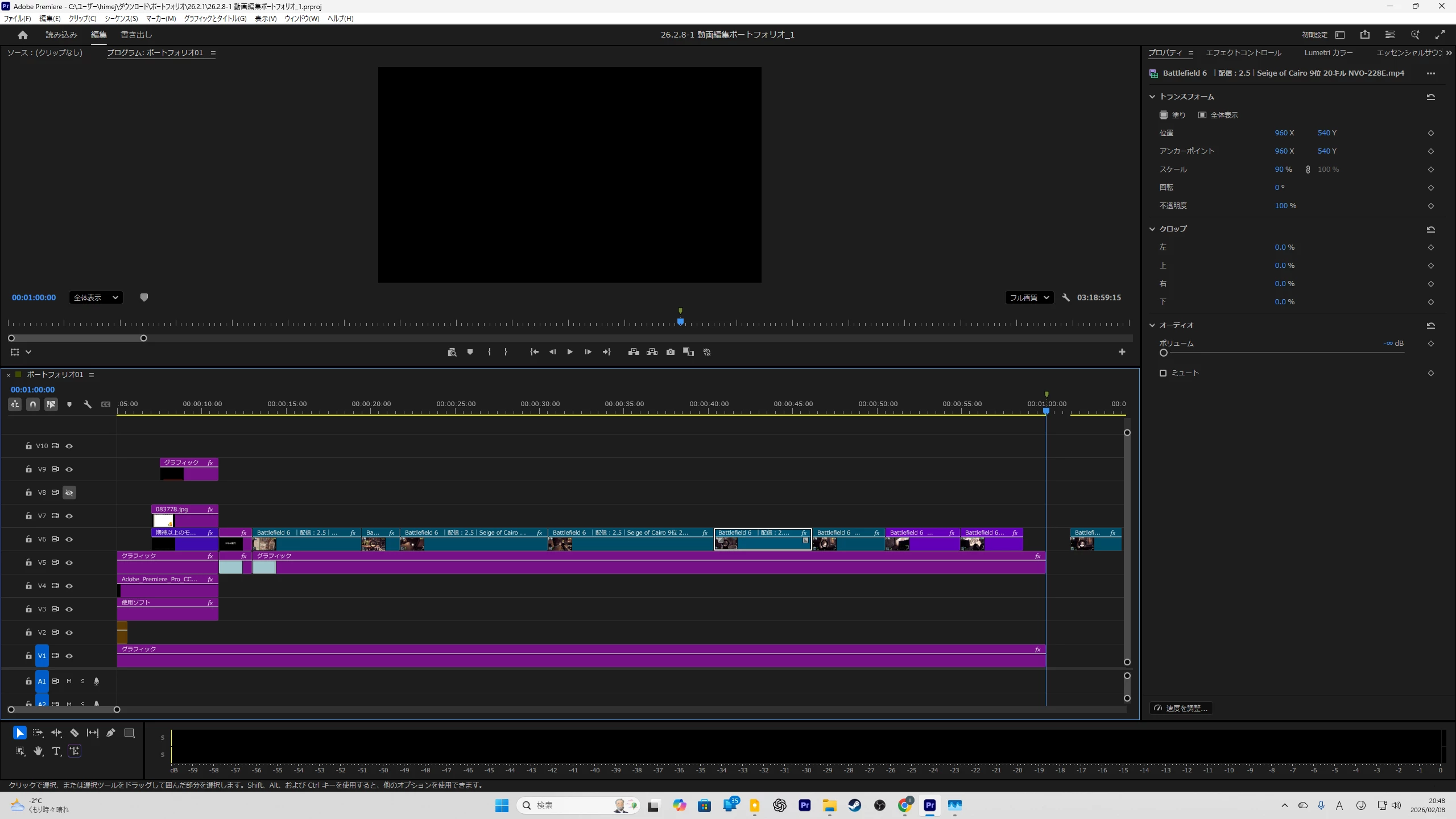 音声は使用しないので動画を全て選択し、ボリュームを「-メビウス」にしたのですが、