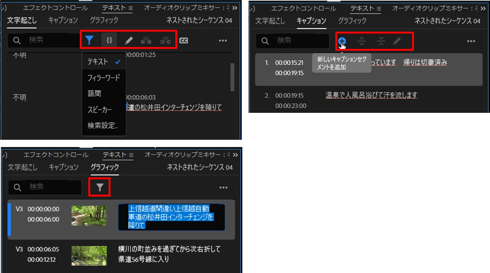 「テキスト」パネルの「文字起こし」、「キャプション」、「グラフィック」の各タブの下図赤枠部のアイコンをクリックするとその場面に応じた編集ができます。