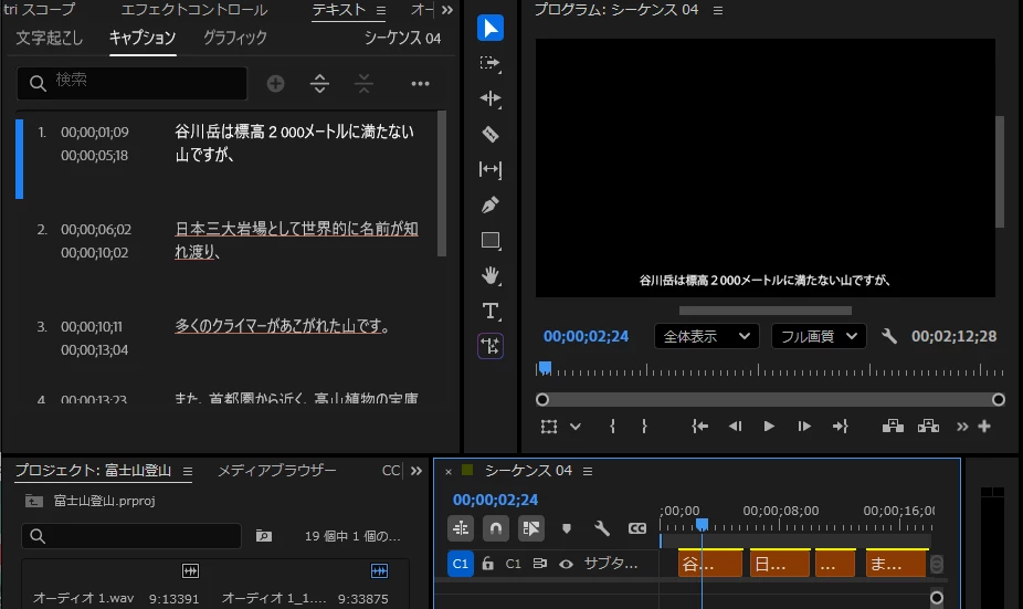 ・「キャプション」タブにキャプションが作成され、ビデオトラックにはC1トラックが作成され、キャプションセグメントクリップが作成されます。