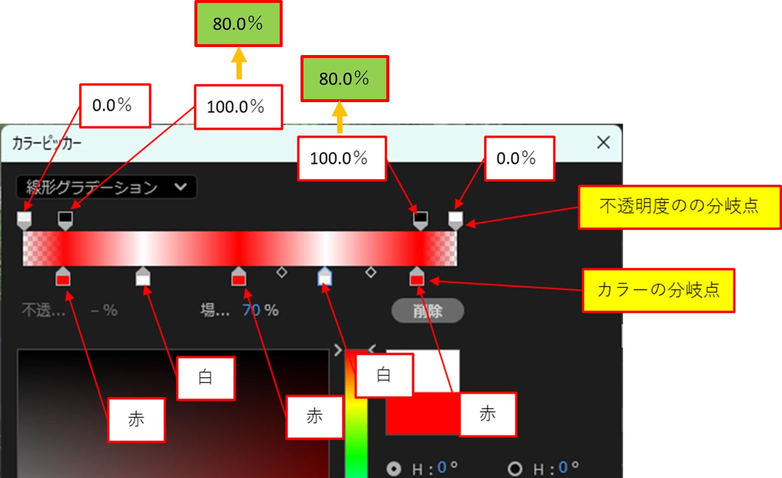上記リンクの回答で、赤白の部分には不透明度をかけませんでしたが、かける場合は下図緑で示したように数値を下げれば両不透明度の分岐点の間に不透明度がかかります。