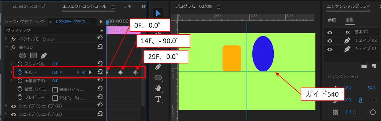 続いて、「基本3D」エフェクトを適用し、「エフェクトコントロール」パネルで、「チルト」に「キーフレーム」を打ちます(値は下図を参照ください。)。ここでは1秒間で、立った状態から後ろに倒れてまた元に戻る動きとします。
