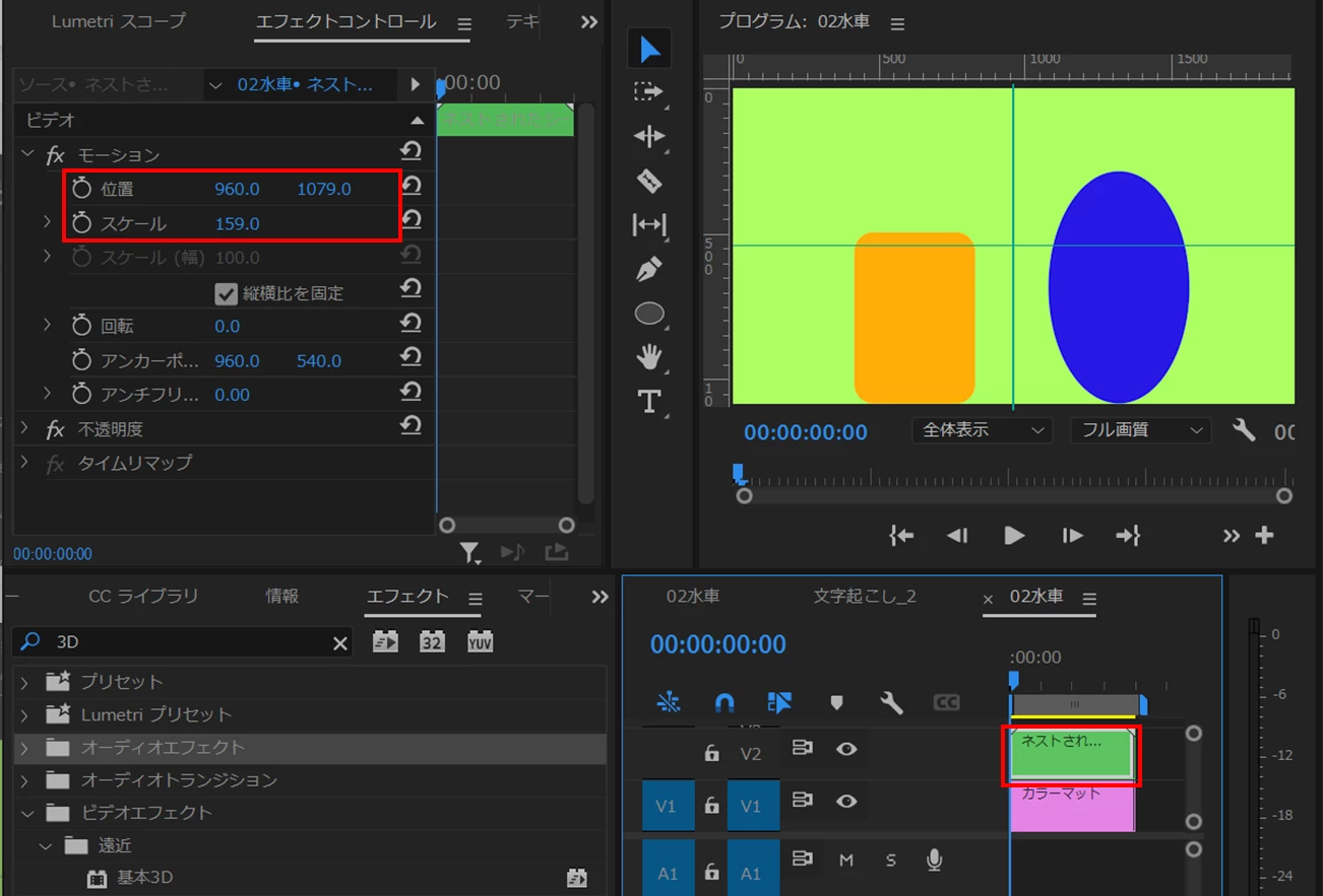 ②クリップをネストします。「エフェクトコントロール」パネルの「位置」と「スケール」で人物の位置と大きさを調整します。