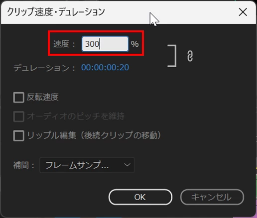 ③メニューの「クリップ」→「速度・デュレーション」を選択し、開いた「クリップ速度・デュレーション」ウィンドウで、「速度」の数値を変えます。300%のすれば3倍の速度になります。