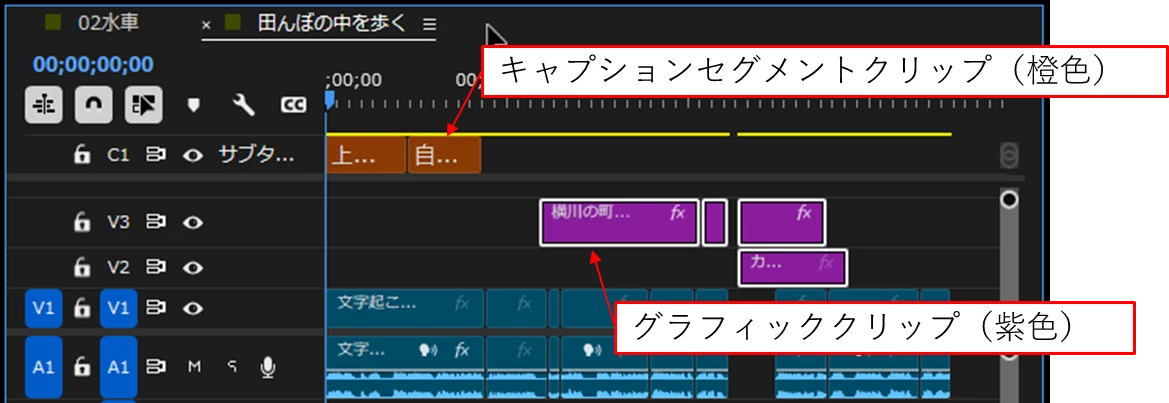 キャプショントラックの橙色のクリップをビデオトラックの紫色のクリップに変換したいということでしょうか。