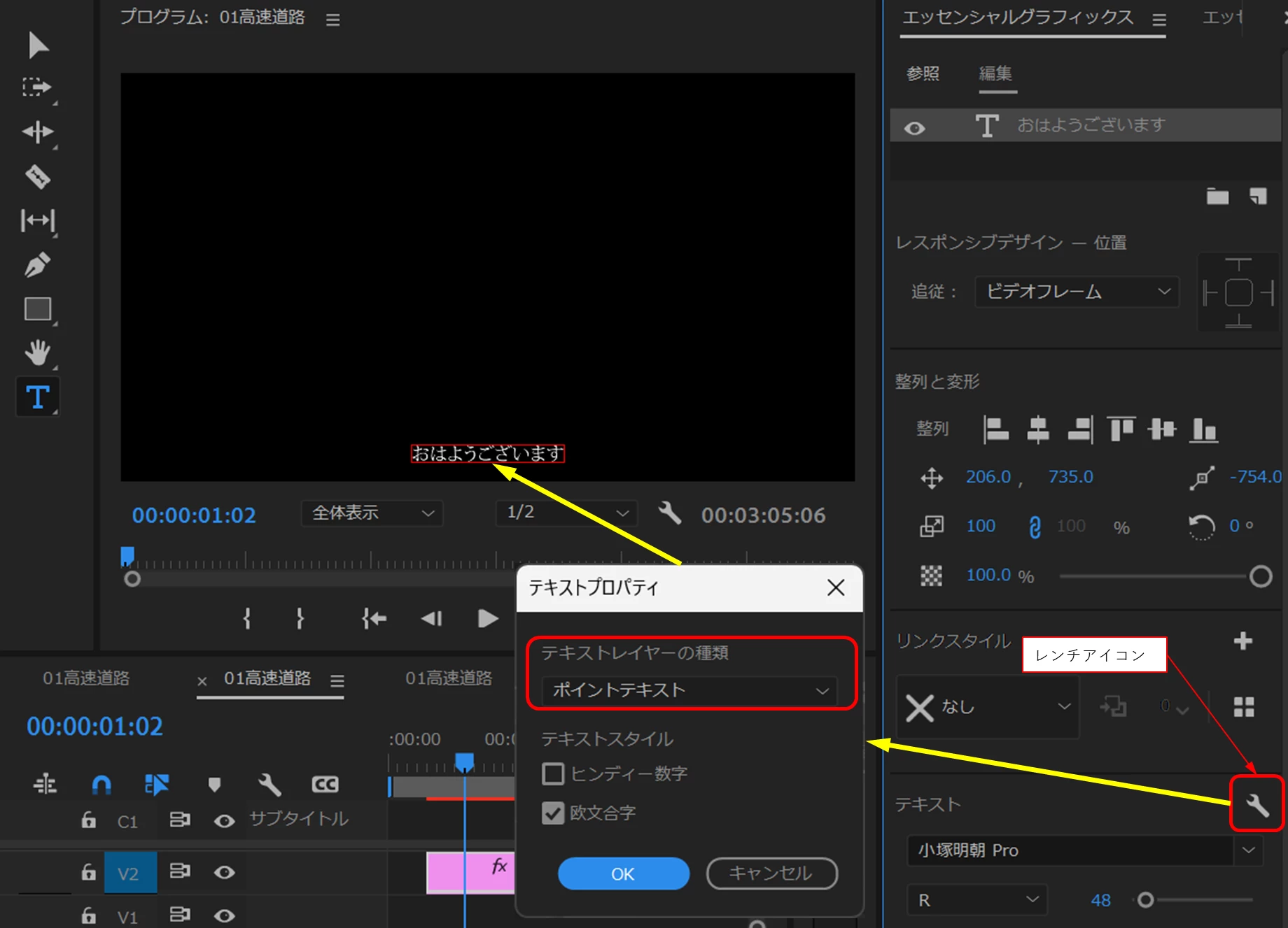 ②「テキスト」項の「レンチアイコン」をクリックし、開いた「テキストプロパティ」ウィンドウで「テキストレイヤーの種類;ポイントテキスト」に設定します。すると赤いテキスト入力ボックスが字幕のサイズに合います。