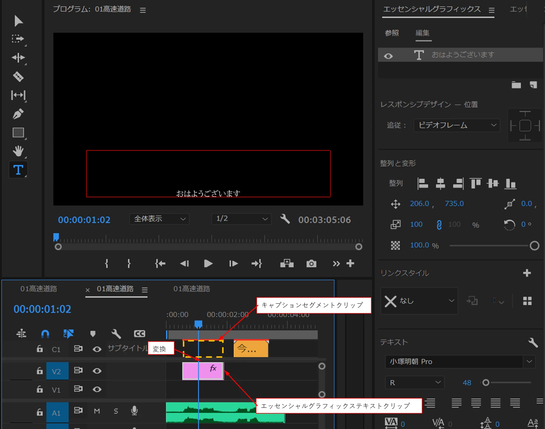 ①文字起こし後、キャプションセグメントクリップ(黄色または橙色のクリップ)を選択して、メニューの「グラフィックとタイトル」→「キャプションをグラフィックにアップグレード」を選択し、「エッセンシャルグラフィックステキスト」クリップに変換します。