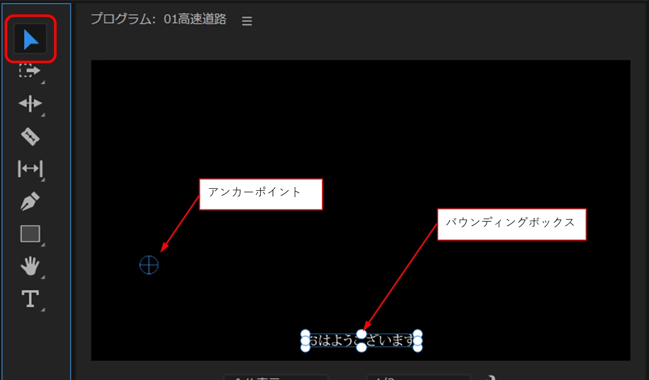 ③「選択ツール」を選択すると、赤いテキスト入力ボックスは青い「バウンディングボックス」に代わります。また斜め左上には赤いテキスト入力ボックスの枠上にあった「アンカーポイント」が表示されます。