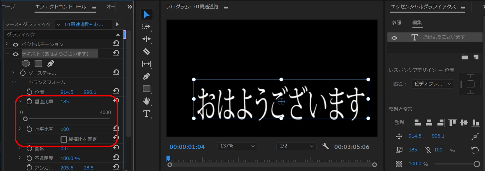 ⑤エッセンシャルグラフィックステキストクリップを選択し、テキストレイヤーを選択し、「エフェクトコントロール」パネルのトランスフォームの「スケール」の「縦横比を固定」のチェックを外し、「垂直比率」または「水平比率」で縦横比を変更します。